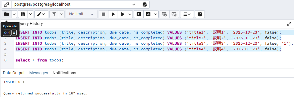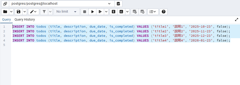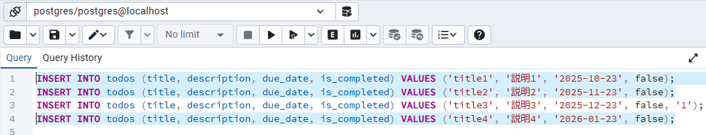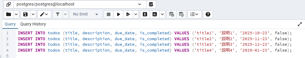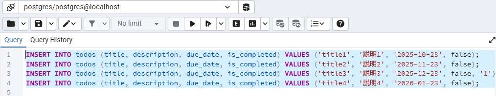 INSERT INTO todos (title, description, due_date, is_completed) VALUES ('title1', '説明1', '2025-10-23', false);