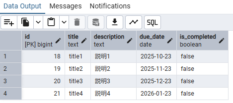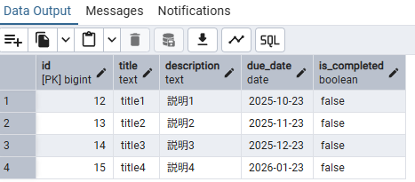| 1 | title1 | 説明1 | 2025-10-23 | false |