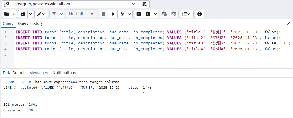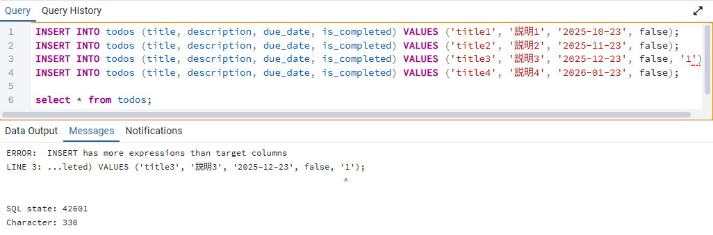 INSERT INTO todos (title, description, due_date, is_completed) VALUES ('title3', '説明3', '2025-12-23', false, '1');
