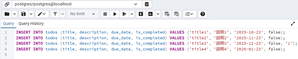 INSERT INTO todos (title, description, due_date, is_completed) VALUES ('title4', '説明4', '2026-01-23', false);