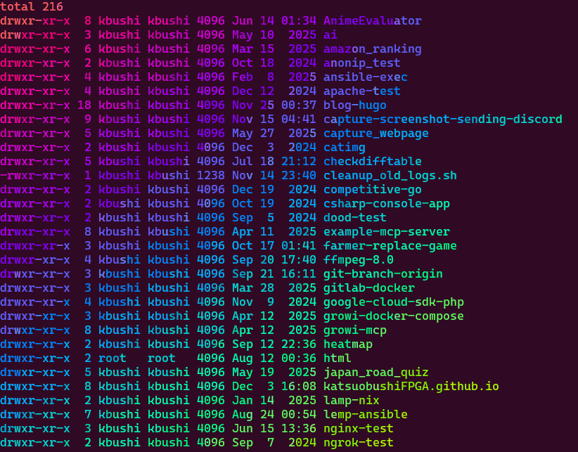 ls -l | lolcat実行すると、ファイル一覧が鮮やかなグラデーションで表示される。